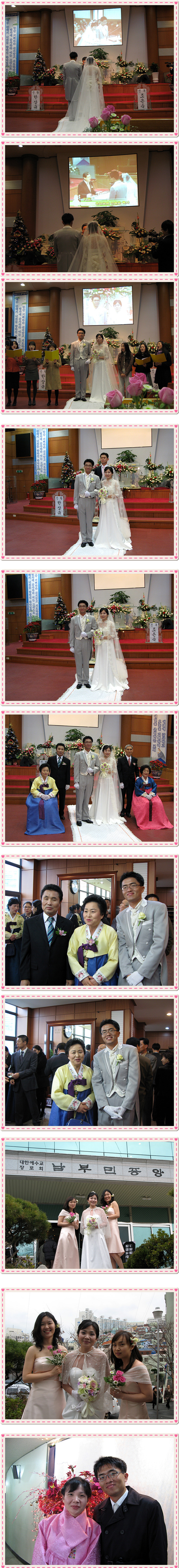 * 사진이 축소되어 있습니다. 클릭해서 예쁘게 봐주세요! 축복입니다 한경택집사님 추늠조전도사님의 장남 신랑한상규군과 신부 조은숙양의 결혼식이 지난 22일(토) 남부민중앙교회에서 있었습니다 새로운 가정에 하나님의 크신 축복으로 가득하시고 한집사님의 가정에 축복의 근원이 되시기를 기도합니다. 찬양으로 축복합니다. 김경숙권사. 찬양 / 아주먼 옛날..