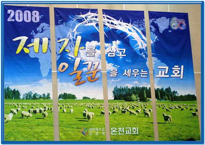 "제자를 삼고 일꾼을 세우는 교회" 2008년 새해 첫주 새로 부임하신 교역자입니다. 1. 김상수목사님가족 (어린이 사역) 2. 조생준강도사님가족 (중등부 사역) 3.박철우강도사님가족 (청년부 사역) 더운 여름... 찬바람씽씽 겨울바람.. 주차로 봉사하시는 주차부원들입니다. 맛있는 국수를 만들어 내는 식당을 살짝 였보았습니다. 2008년도에도 "주님의기쁨"이 되는 온천교회 찬양 / 나주님이 기쁨되기 원하네