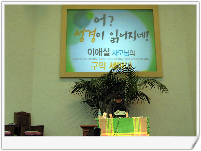 어? 성경이 읽어지네! 세미나. 기 간 : 2008년 9월 7일(주)~11일(목) 시 간 : 저녁 7시~11시 강 사 : 이애실 사모 하반기 순모임으로 순원들과 함께 구약성경을 읽고 있습니다 내일 저녁 하루가 남았습니다 대단한 열심으로 늦은 밤시간까지 강의를 하시는 이애실 사모님의 명강의에 참석하시는 순원들의 열의가 대단하십니다 찬양/ 오직 믿음으로