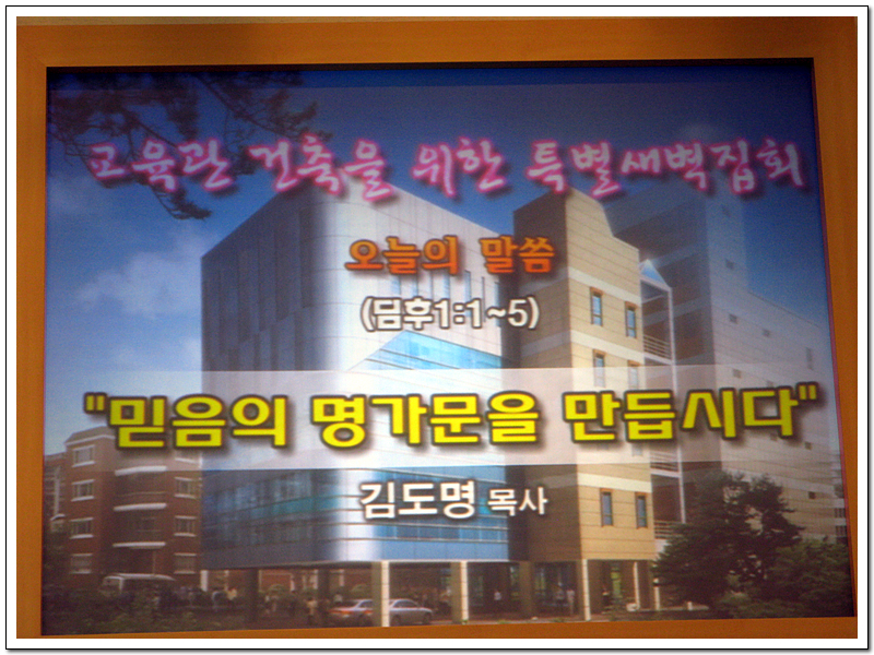 교육관 건축을 위한 특별새벽기도회 21일(월)~25일(금) 금요일 5시 말씀 / 김도명목사 / 딤후1:1~5 "믿음의 명문가문을 만듭시다" 특송 / 청년 1.2부 기 도/ 임창모안수집사