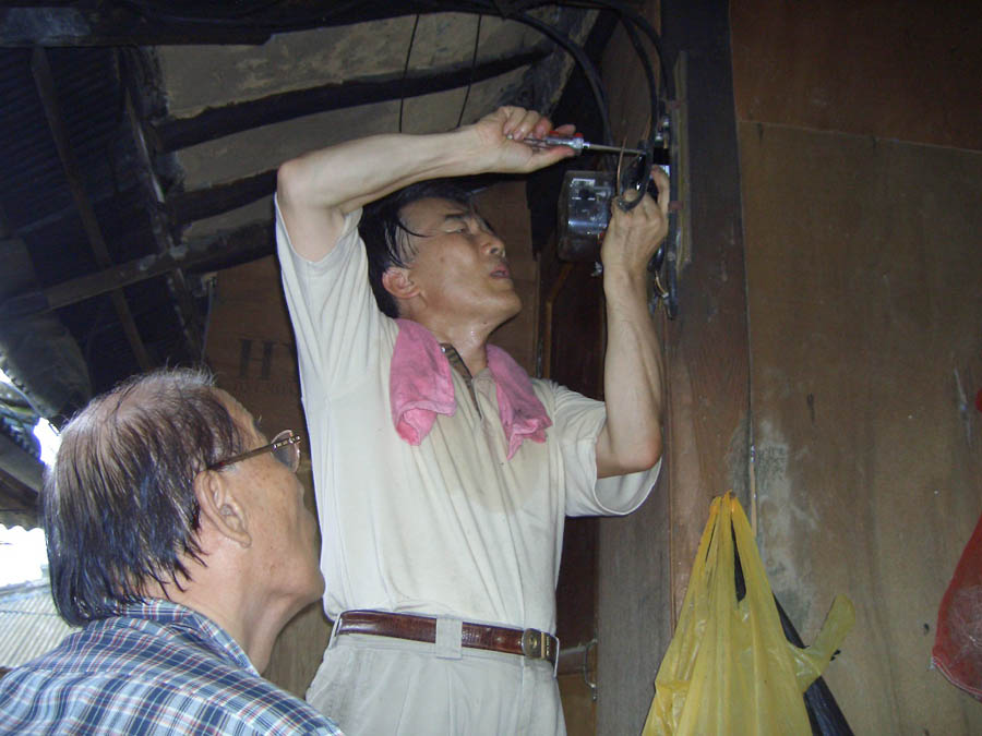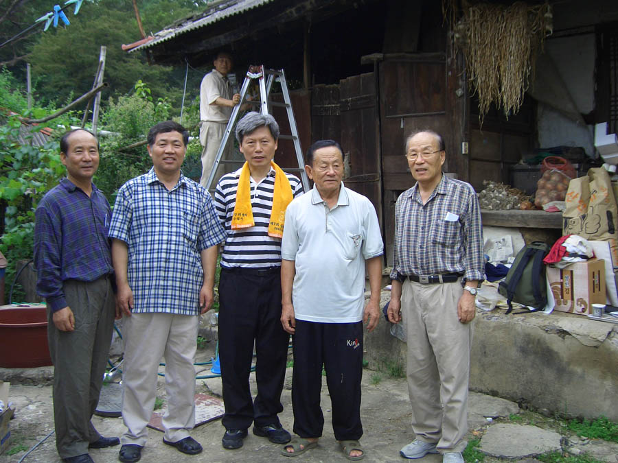 임채홍집사님의 전기고장 수리는 어떤 고장도 척척... 홀로 사시는 독거노인들에게 희미한 전깃불을 화환하게 밝혀드리고 마음마저 활~짝 따뜻하게 데워드렸습니다 홀로사시는 집 주인 할아버지 께서 봉사자들의 사랑에 감동되어 장마교회에 등록하게 되었읍니다 장마교회 목사님과 함께 기념촬영.