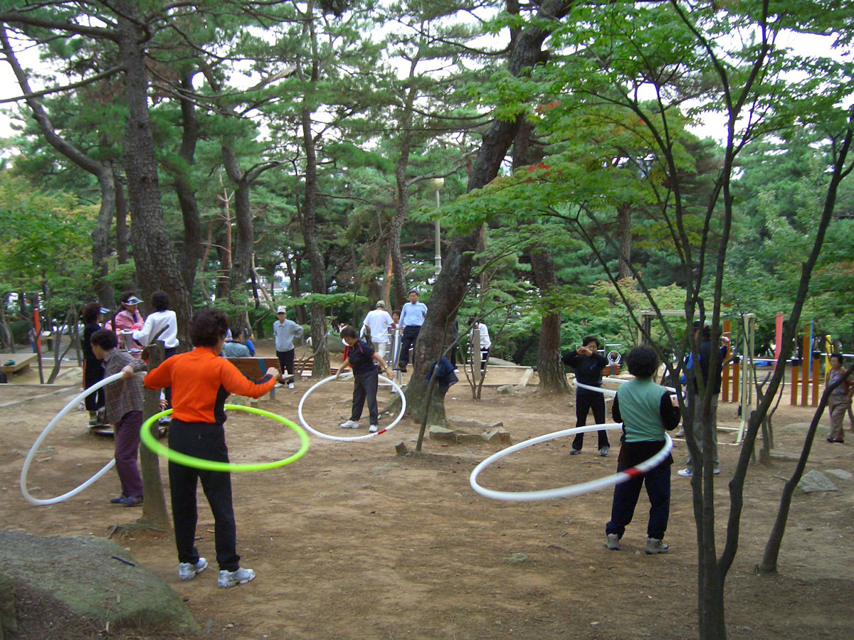 온천교회 마-크가 쓰여진 훌라후프가 신나게 돌아가며