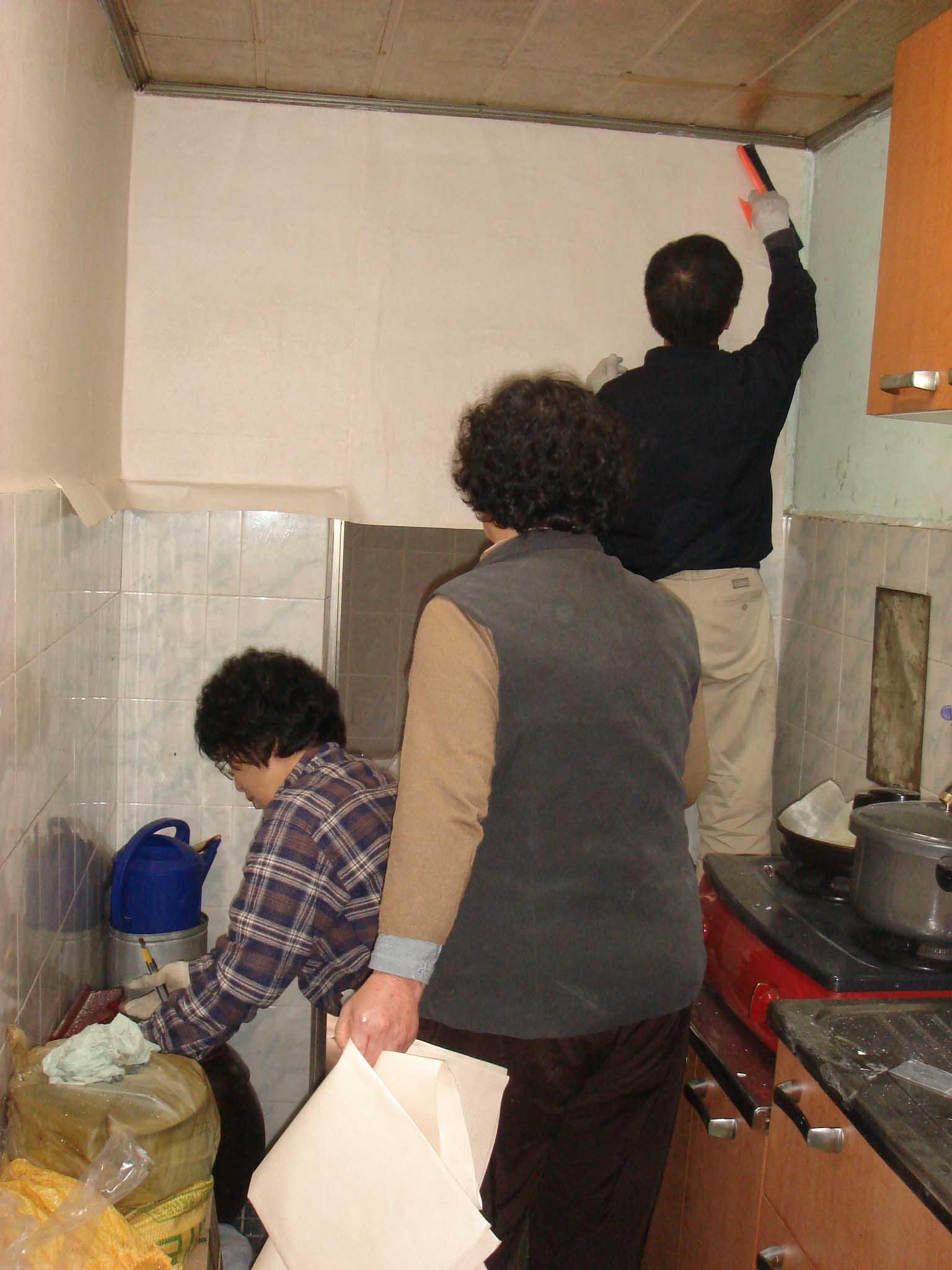 이철호 장로님께서 직접 풀비를 잡고 홍성순 권사님 최계숙 집사님께서 주방의 벽 도배에 여념이 없으시다.