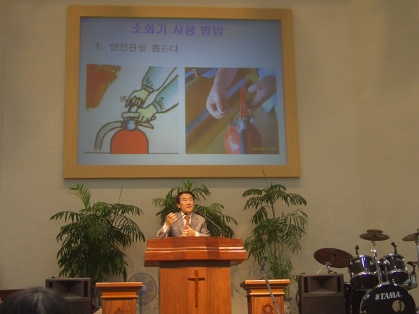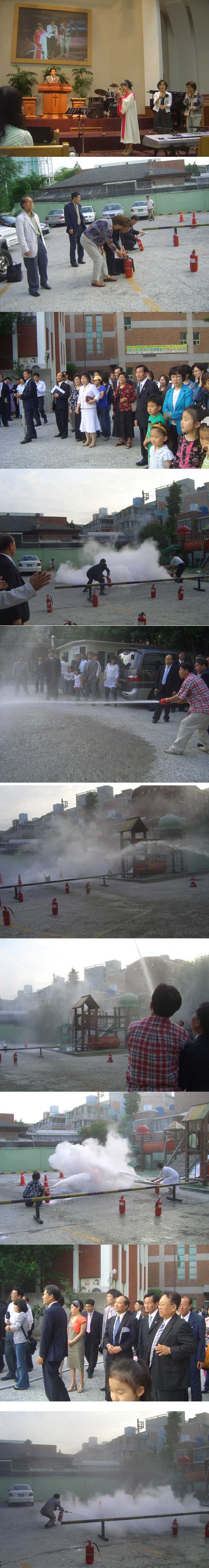 소방 훈련 자위 소방대 조직 주일 오후 예배후에 소방 훈련을 위한 설명회가 관리위원장 공재현장로의 사회로 진행되었다. 소방 훈련 진행은 임채홍집사의 실재 사항의 대비와 앞 마당에서 실재 화제 현장의 훈련 시범이 교육되고 있다