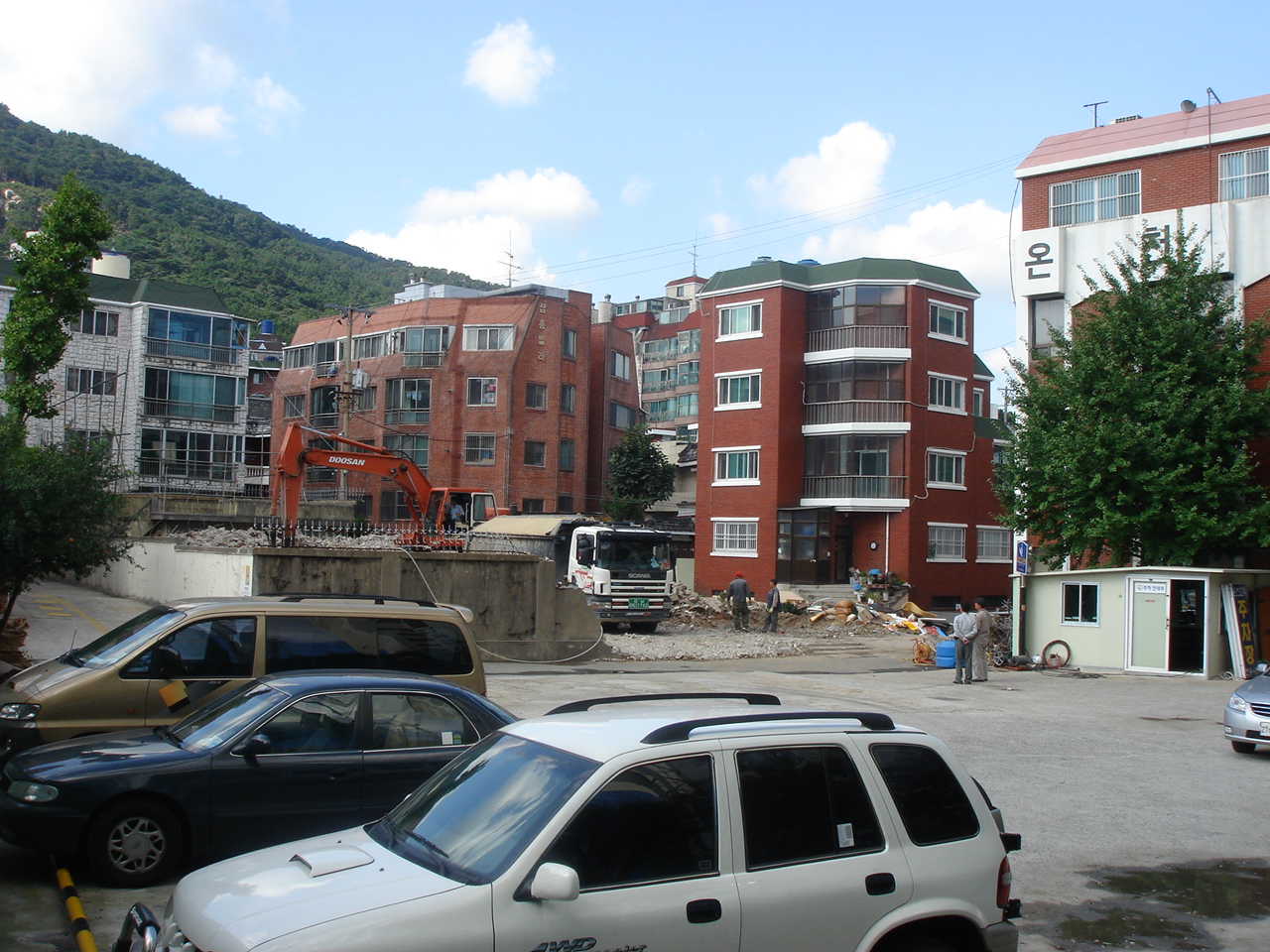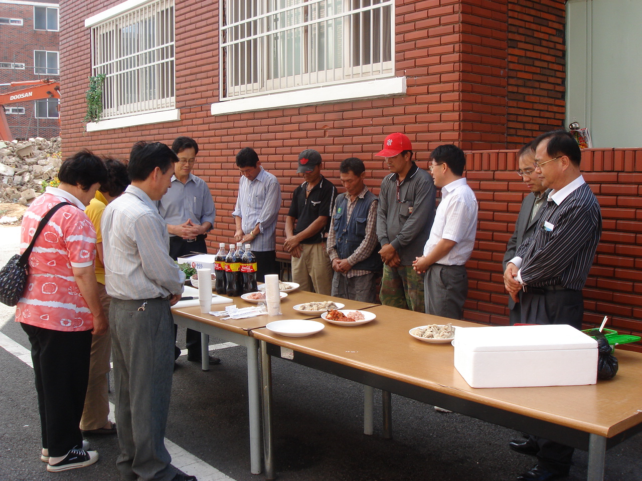 사진 하 는 이웃들에게 떡을 돌리기 전에 철거시공자들과 초졸한 음식상 장면