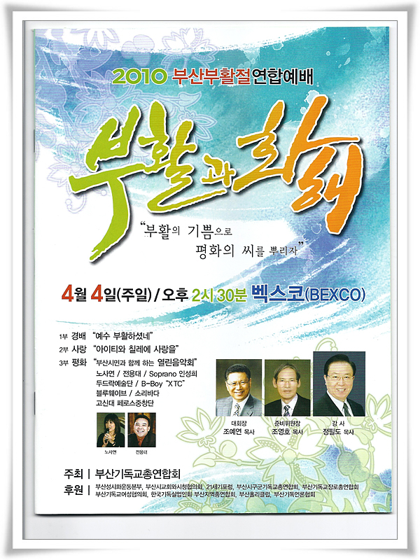 2010 부산부활절연합예배 부활과 화해 "부활의 기쁨으로 평화의 씨를 뿌리자" 때 / 4월4일(주일)/오후2시30분 장소 / 벡스코(BEXCO) 주최 / 부산기독교총연합회 찬양 / 연합찬양대 할렐루야 지휘 / 연명희목사(CBS권사성가단지휘 소명교회음악목사) 1부 경배 "예수부활하셨네" 2부 사랑 "아이티와 칠례에 사랑을" 3부 평화 "부산시민과 함께하는 열린음악회" 찬양 / 기쁘 찬양해